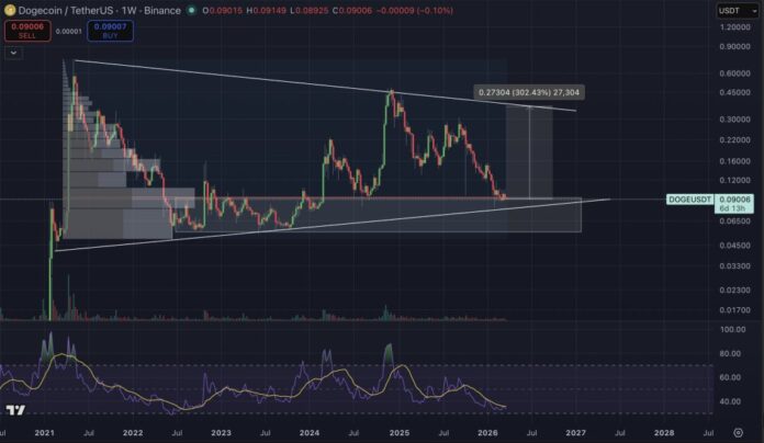 Taylor’s thesis is built almost entirely on structure. On the weekly DOGE/USDT chart he shared, Dogecoin was sitting near $0.09006, pressed into the lower boundary of a broad pennant formation that has contained price action for years. The same chart marked a projected move to roughly $0.27304, labeled as a 302.43% upside swing from current levels.