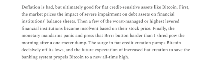 This is a dramatic chain of events: AI job losses lead to credit losses, which cause bank stress, which forces the central bank to expand money supply, which lifts Bitcoin.
