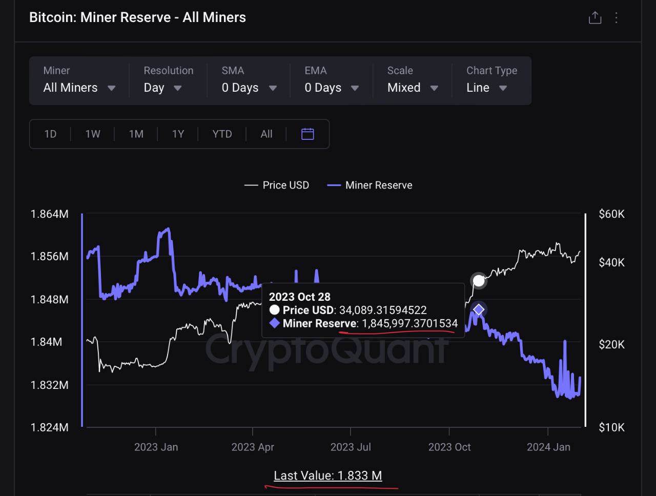 Before this selling started, the miner reserve had a value of around 1,84,997 BTC. Following the decline that the indicator has witnessed since then, the miners now hold about 1,833,222 BTC.