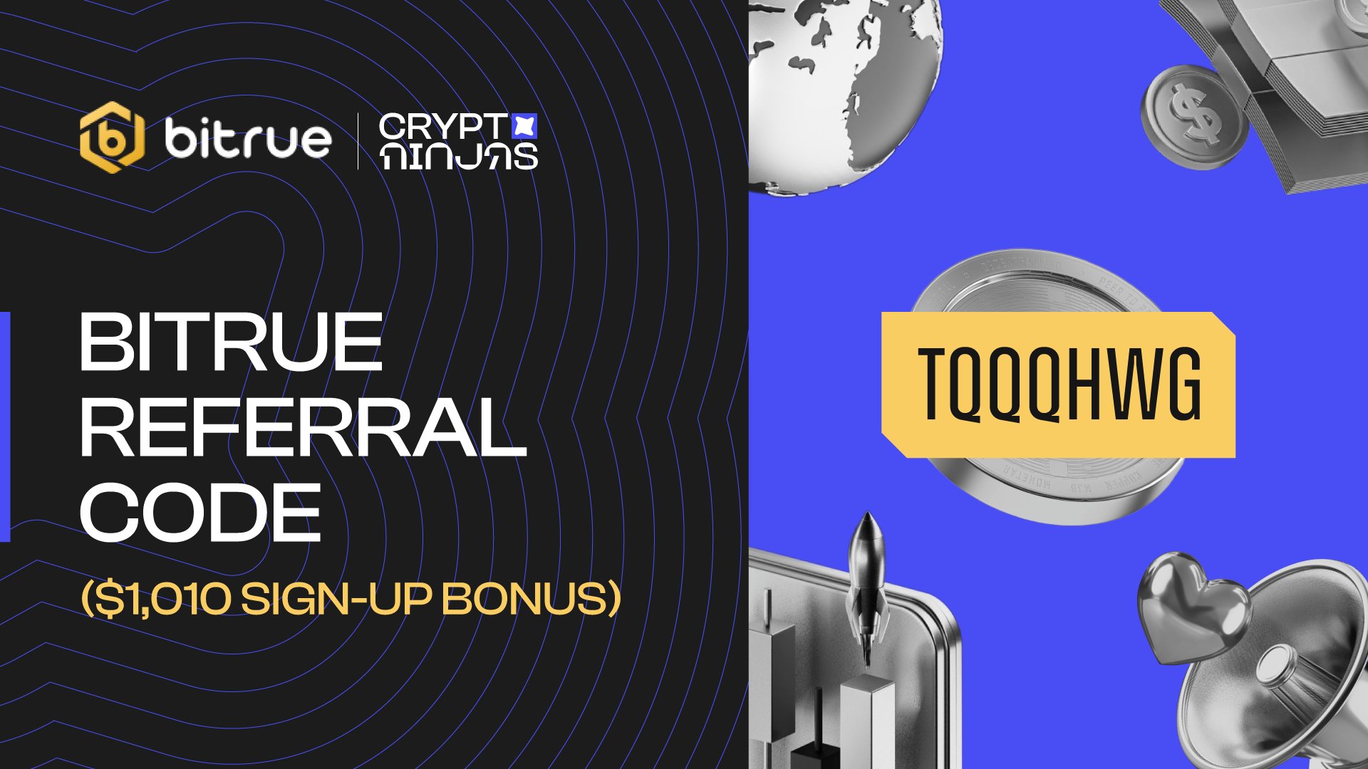 A Bitrue referral code is a unique combination of letters and numbers you can use when signing up on the Bitrue exchange to get a free crypto welcome bonus. The best Bitrue referral code is TQQQHWG, which gives you a $1,010 sign-up bonus and up to 40% off trading fees. To use our invitation code and claim the referral bonus, you need to sign up using a referral link, complete KYC, deposit funds, and trade futures.
