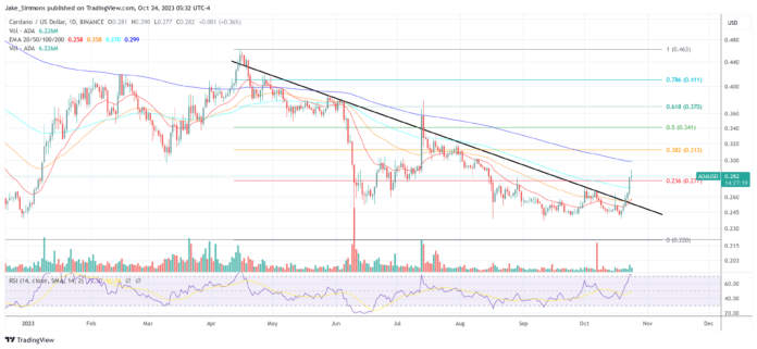 The Cardano price has seen a strong uptrend in the past few hours, in line with the overall crypto market. At the time of writing, ADA was trading at $0.282, up 6.5% over the past 24 hours. The 1-day chart of ADA shows that ADA was able to break out of its 6-month downtrend (black line) this past Sunday. On April 15, ADA marked its high for the year at over $0.46, since then the Cardano price has been on the decline.