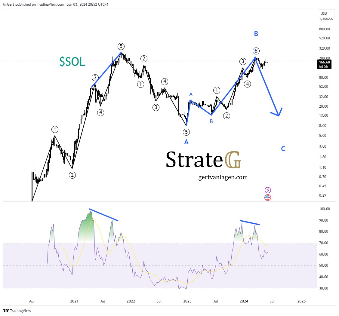 Van Lagen posted via X: “I’m short on SOL –> ready for the next leg down. 2021: Finalized a clean Elliottwave up; 2022: A-wave down of prolonged bear market <- 5 subwaves; 2023: B-wave of prolonged bear market <- 3 subwaves; 2024: Expectation is C-wave down. Bearish divergence on the weekly RSI.”