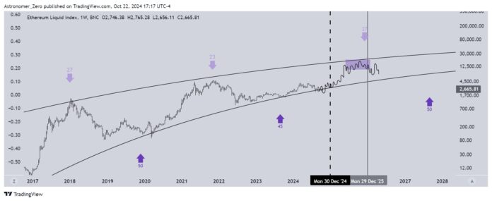 For Ethereum, Astronomer notes a similar but compressed cyclical pattern compared to Bitcoin. “ETH typically drops later near the 4-year cycle peaks (2014, 2018, 2022) and has its surge also later in the 4-year cycle (2016, 2020), making its moves seem more aggressive,” he explained.