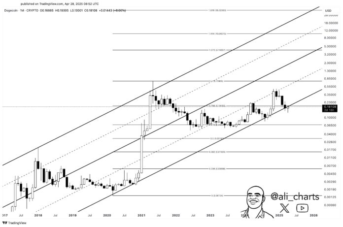 In a new post on X, analyst Ali Martinez has shared a technical analysis (TA) pattern that the monthly price of Dogecoin has been showing recently. The pattern in question is an “Ascending Channel,” which is a type of Parallel Channel.