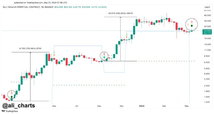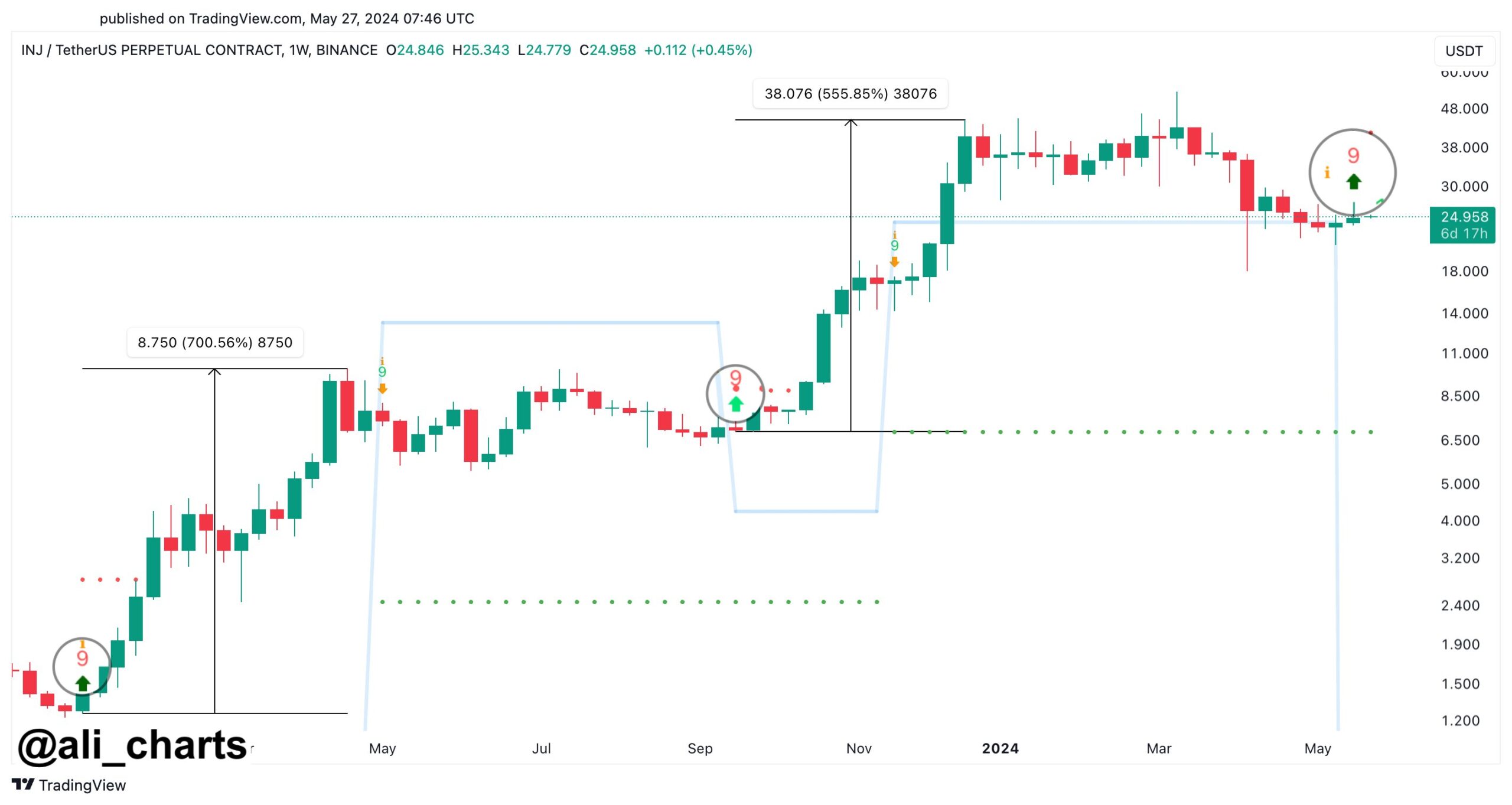 In a new post on X, analyst Ali Martinez has discussed a Tom Demark (TD) Sequential signal that has formed in the weekly price of Injective recently. The TD Sequential refers to an indicator in technical analysis (TA) generally used for spotting potential points of reversal in any asset’s price.