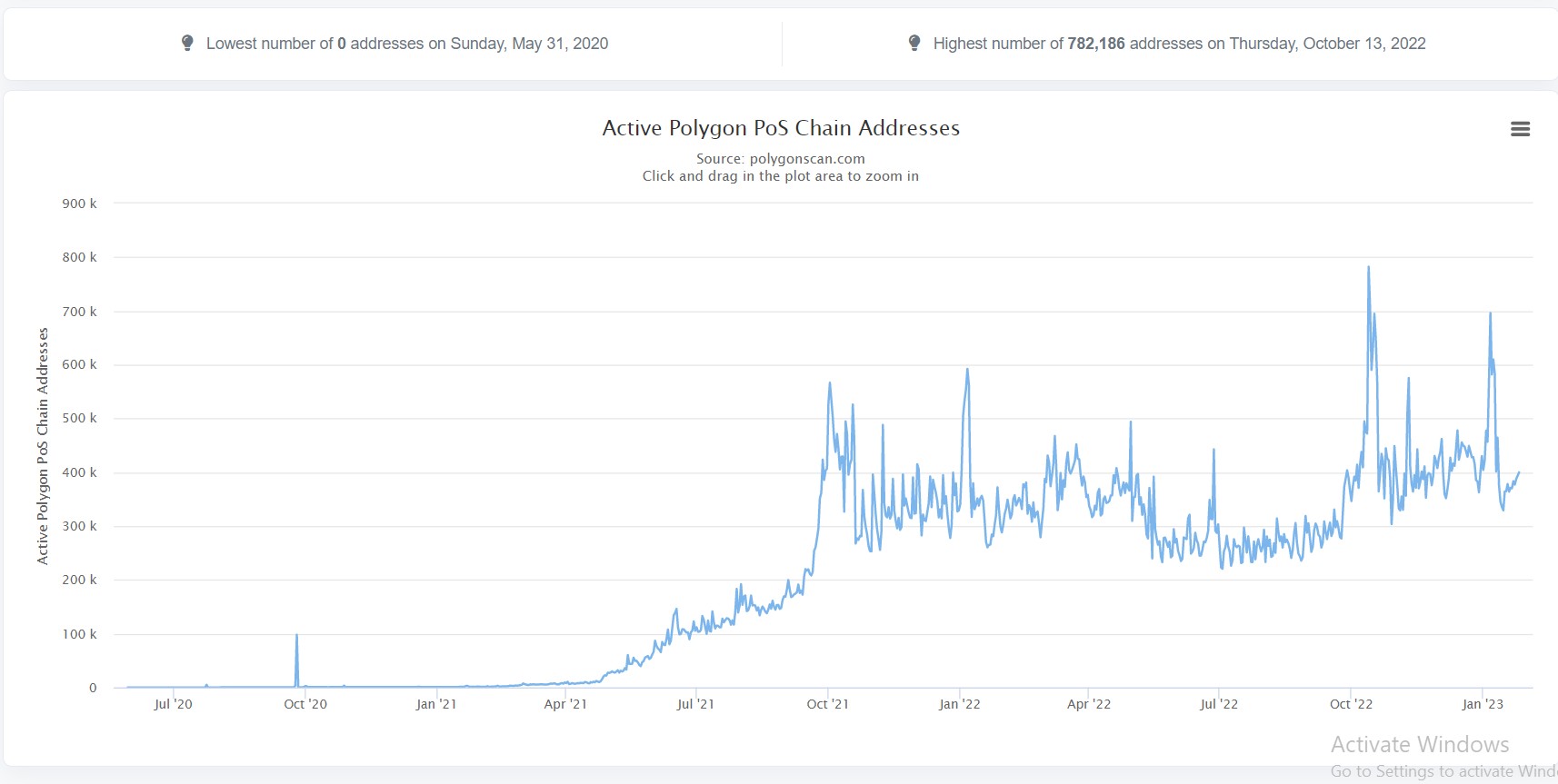 However, today, the figure has declined more than 10%, dropping to approximately 399,000, according to data from PolygonScan. The reason behind the plummet is still unclear, as the network activity is expected to increase, given the network’s recent collaborations with multiple top companies.