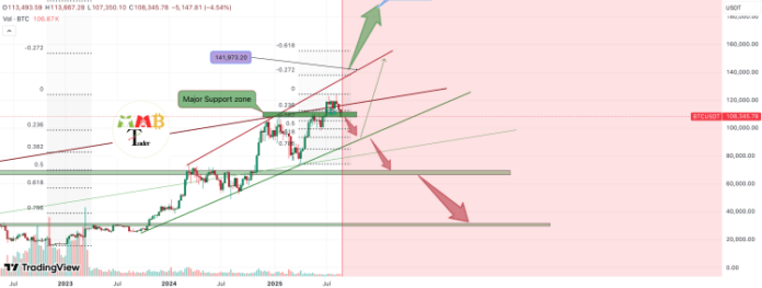 A price jump from this support level could end in another 30% price increase, pushing the price above the $137,000 level. However, the analyst remains adamant that there is more possibility of a breakdown. “I am thinking of breakout to the downside and more dump after that like red arrows maybe now with higher possibility,” MMBTtrader stated.