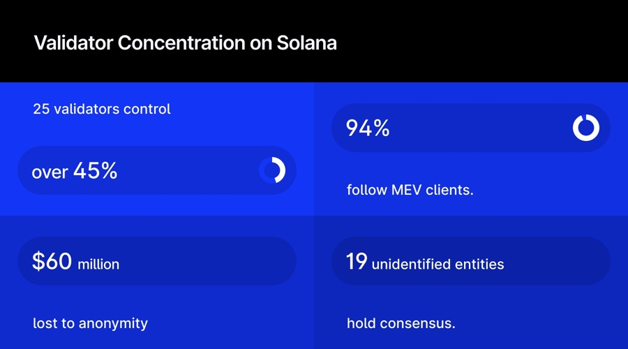 accountability. Solana’s 19-validator Nakamoto Coefficient exemplifies this: 19