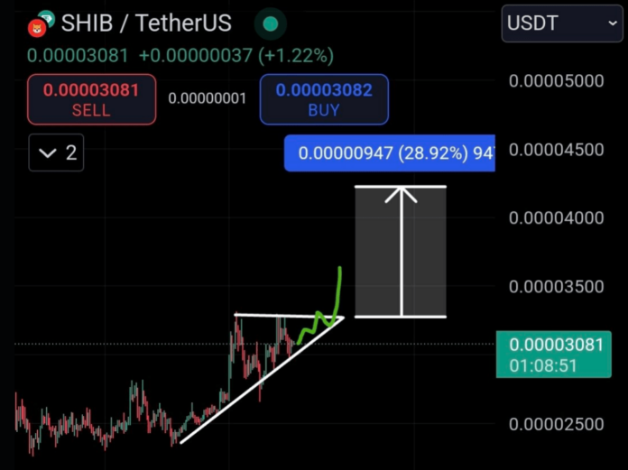 The coin is currently filling a bullish pattern on its price chart, according to Shiba Inu analyst Shib Knight. Knight noted in a recent tweet that an ascending triangle is building on the SHIB/USDT chart.