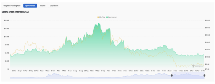 According to CoinGlass, Solana’s open interest is currently around $5.45 billion, a level that stands far below the peaks seen during the late-2025 run-up.