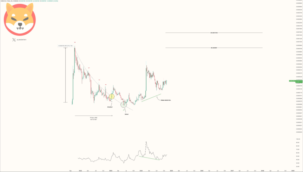 In a post, analyst Javon Marks said that it could potentially hit the $0.00081 mark, adding that this price surge is imminent for the meme coin and being forecasted to happen really soon.