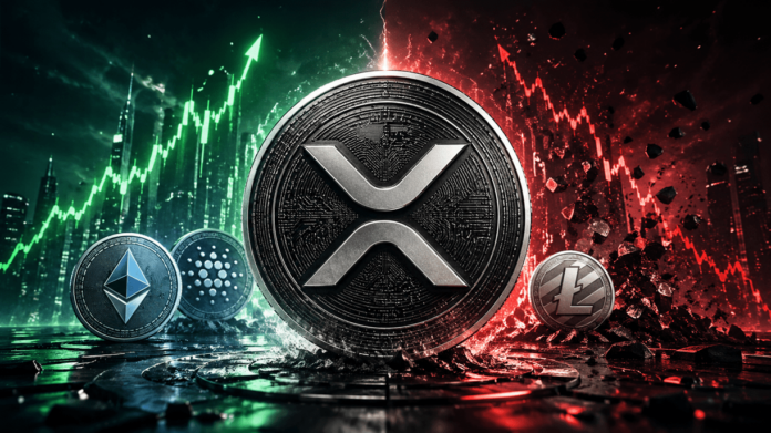 The core tension is not limited to XRP. The report frames XRP alongside Ethereum, Cardano and Litecoin as major altcoins that have either failed to produce meaningful new cycle highs or have only marginally exceeded prior peaks. For XRP specifically, the author notes that it has set a new all-time high this cycle, but only by roughly 10% to 20%, leaving open the question of whether the move represents genuine expansion or merely another deviation within a much larger range.