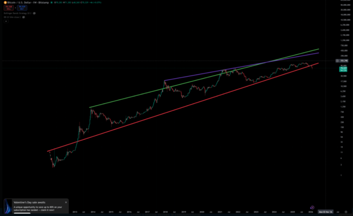 Riley bases part of his prediction on long-term trendlines. According to him, Bitcoin’s price has slipped below significant trendlines drawn over the past decade.