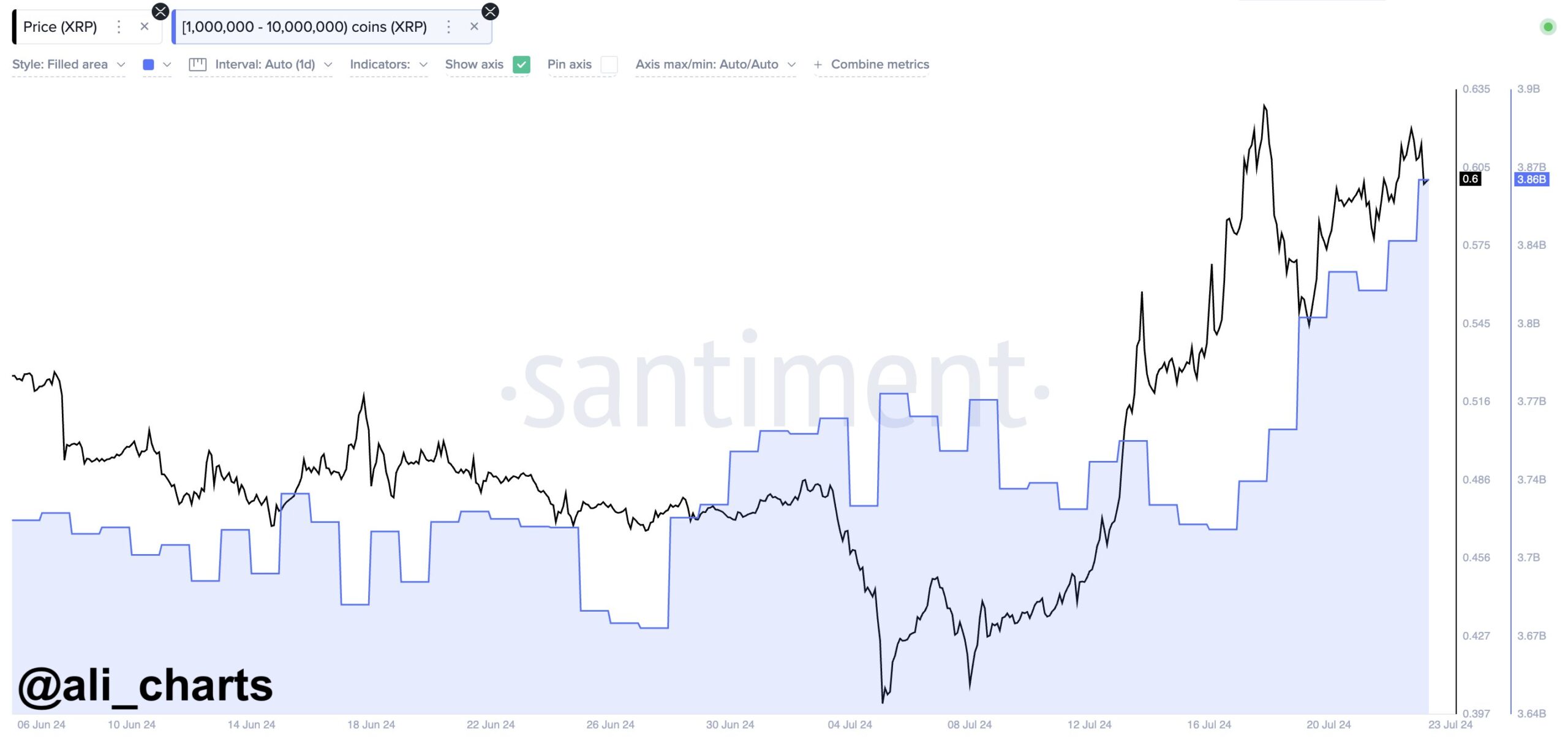 As explained by analyst Ali Martinez in a new post on X, the XRP whales have increased their supply share recently. The on-chain indicator of relevance here is the “Supply Distribution” from the analytics firm Santiment, which tells us about the total amount of tokens a given wallet group holds.
